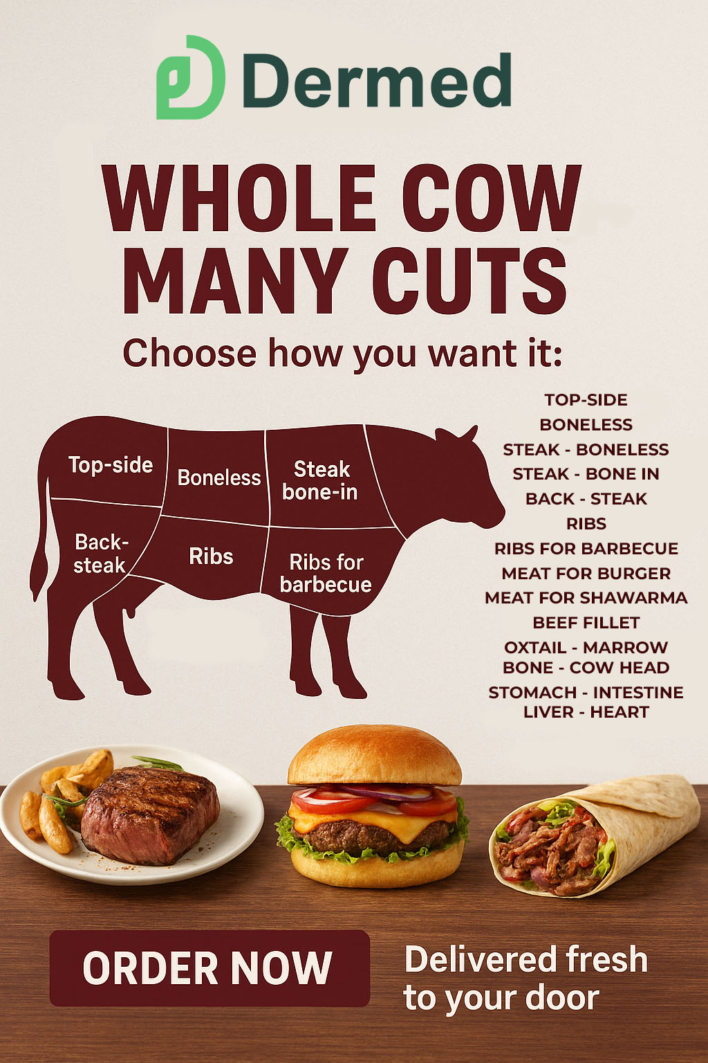 Cuts: Top-side Boneless Steak – boneless Steak – Bone in Back – steak Ribs Ribs for Barbecue Meat for Burger Meat for Shawarma Beef Fillet Oxtail – marrow bone – cow head Stomach – intestine liver – heart